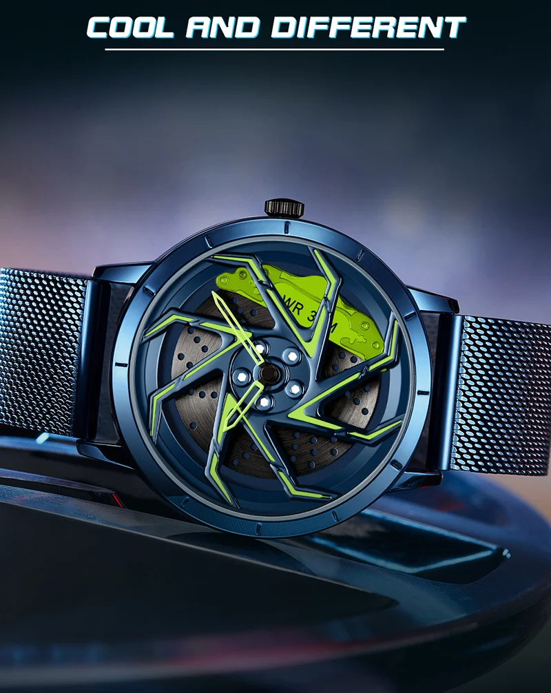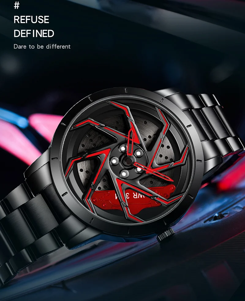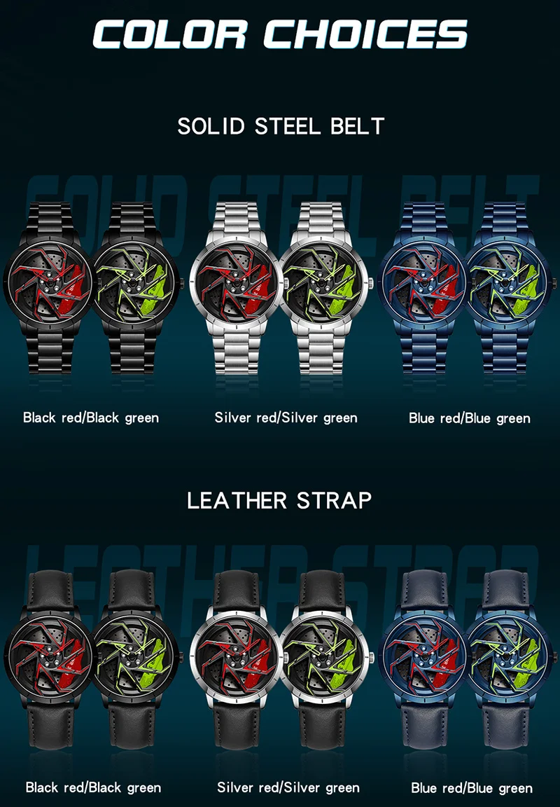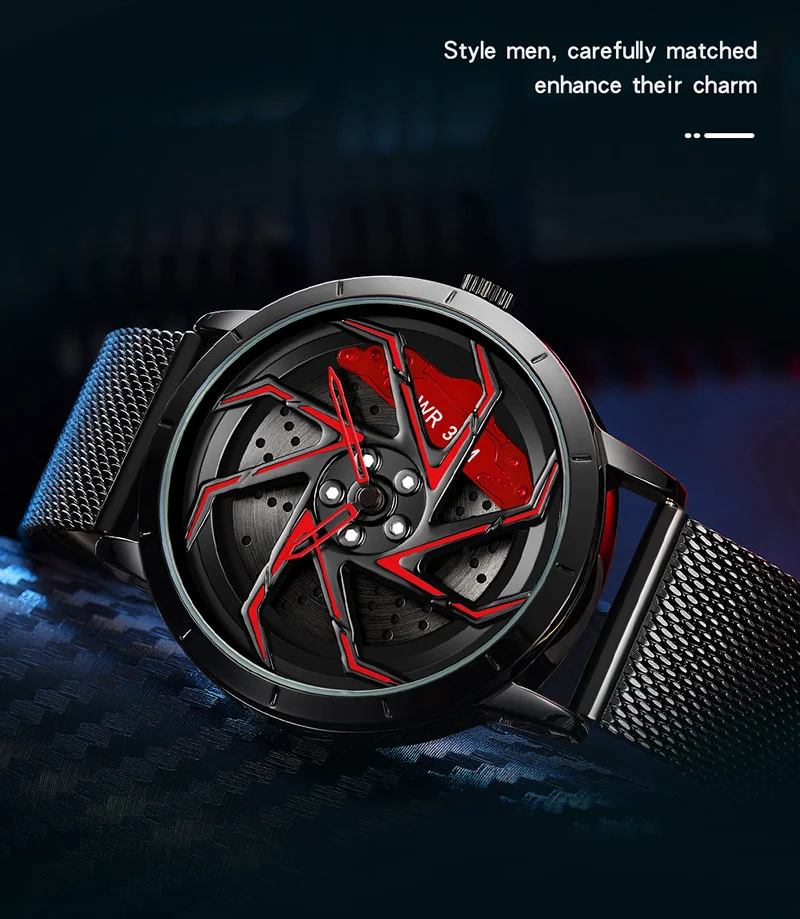 P1088 Hot Sell Stainless Steel Band Watch Premium Quartz Movement Car Rim Wheel Shaped Rotating Dial Relogio Masculino